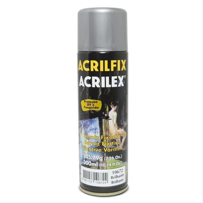 Acrilfix - 300ml - Brilhante da Acriflex. Vernizes em spray especiais para dar acabamento e proteção às pinturas em telas sobre tintas a óleo ou tintas acrílicas e em trabalhos artesanais. Podem ainda ser utilizados para proteger desenhos, plantas, documentos, layouts, fotos etc. Depois de secos, deixam sobre o trabalho uma película transparente brilhante, fosca ou semibrilhante dependendo do tipo aplicado.