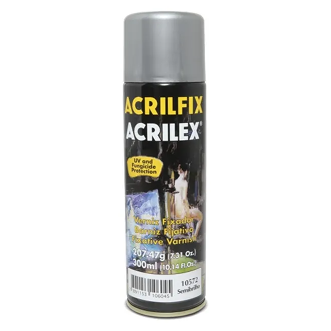 Acrilfix - 300ml - SemiBrilho da Acrilex. Vernizes em spray especiais para dar acabamento e proteção às pinturas em telas sobre tintas a óleo ou tintas acrílicas e em trabalhos artesanais. Podem ainda ser utilizados para proteger desenhos, plantas, documentos, layouts, fotos etc. Depois de secos, deixam sobre o trabalho uma película transparente brilhante, fosca ou semibrilhante dependendo do tipo aplicado.