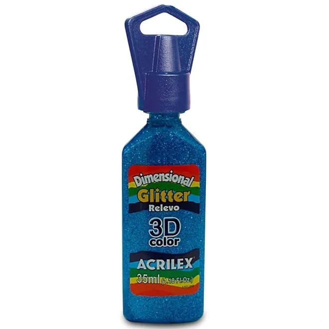 Dimensional Glítter - 35ml - Azul - 204 da Acrilex. A Tinta Dimensional Relevo 3D é bastante versátil, e pode ser aplicada sobre diversos materiais, inclusive sobre tecidos. Resistente a lavagens e não tóxica. Apresentada em 4 versões: Brilliant, Metallic, Glítter e Acqua.