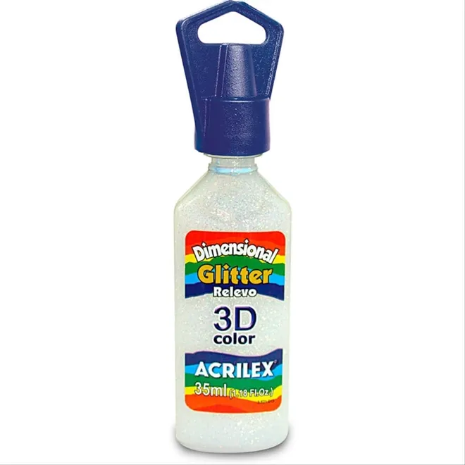 Dimensional Glítter - 35ml - Cristal - 209 da Acrilex. A Tinta Dimensional Relevo 3D é bastante versátil, e pode ser aplicada sobre diversos materiais, inclusive sobre tecidos. Resistente a lavagens e não tóxica. Apresentada em 4 versões: Brilliant, Metallic, Glítter e Acqua.