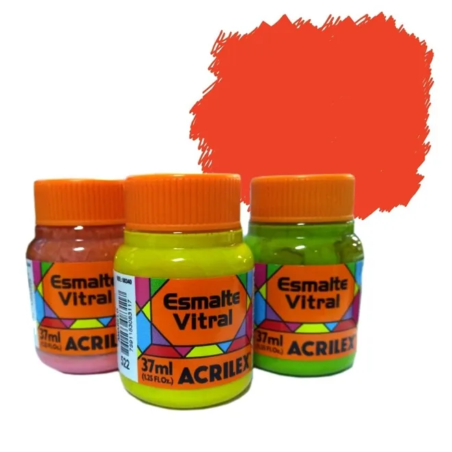 Esmalte Vitral - 37ml - Laranja - 517 da Acrilex. Tinta de alta qualidade, à base de solvente. As 31 cores do Esmalte Vitral (6 metálicas) são opacas e brilhantes e apresentam ótima cobertura. Todas as cores são miscíveis entre si. Indicadas para vidro, porcelanas e faianças, pode-se imitar o efeito de vitrais trabalhando com a Pasta Relevo Vitral. Para fins exclusivamente decorativos.São excelentes tintas também para pintura de metal, madeira, papel vegetal, papelão, cerâmica, gesso ou acetato.Não resistentes a lavagens agressivas com produtos químicos domésticos e longa exposição ao tempo.