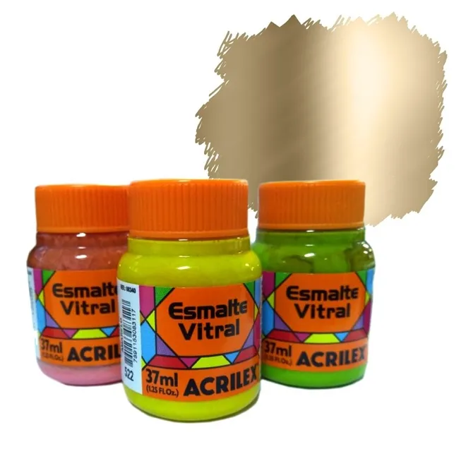Esmalte Vitral - 37ml - Bronze - 556 da Acrilex. Tinta de alta qualidade, à base de solvente. As 31 cores do Esmalte Vitral (6 metálicas) são opacas e brilhantes e apresentam ótima cobertura. Todas as cores são miscíveis entre si. Indicadas para vidro, porcelanas e faianças, pode-se imitar o efeito de vitrais trabalhando com a Pasta Relevo Vitral. Para fins exclusivamente decorativos.São excelentes tintas também para pintura de metal, madeira, papel vegetal, papelão, cerâmica, gesso ou acetato.Não resistentes a lavagens agressivas com produtos químicos domésticos e longa exposição ao tempo.
