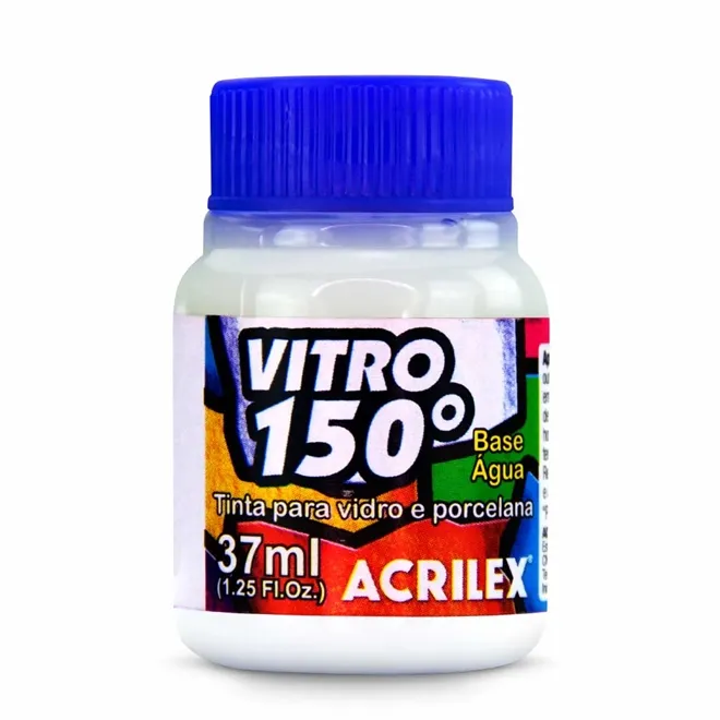 Tinta Vitro 150 - 37ml – Branco - 519 da Acrilex. Indicada para pinturas em peças de vidro, cerâmica, porcelana e faiança. Produto resistente à lavagens. Deve ser levado ao forno para completa fixação da pintura. Disponível em 12 cores em potes de 37ml.
