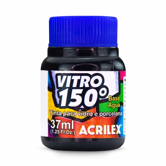 Tinta Vitro 150 - 37ml - Preto - 520 da Acrilex. Indicada para pinturas em peças de vidro, cerâmica, porcelana e faiança. Produto resistente à lavagens. Deve ser levado ao forno para completa fixação da pintura. Disponível em 12 cores em potes de 37ml.